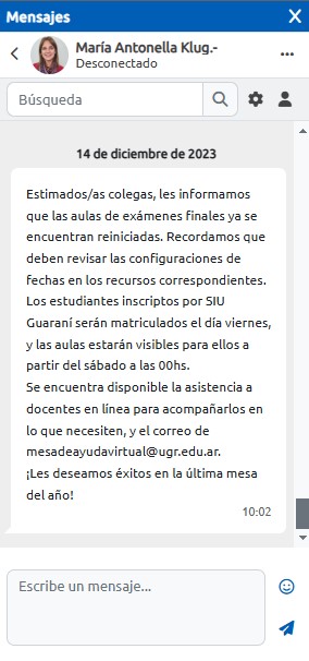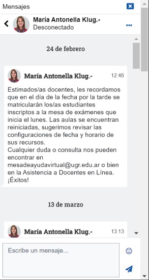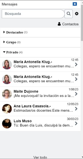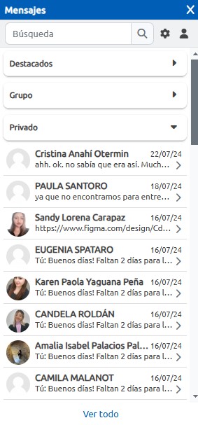 Se aplicó la nueva paleta de estilos para unificar visualmente el entorno. Dentro del chat general, se reorganizaron el buscador y las opciones para ubicarlos en una sola línea, optimizando el espacio. En la vista de conversación, se eliminó la repetición de nombres y avatares en cada mensaje, reduciendo la saturación visual y mejorando la legibilidad general