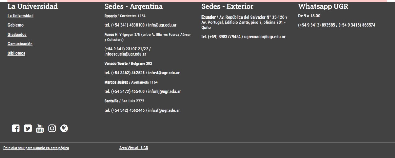 En el pie de página se incorporó el logo institucional con un acceso directo a la página de inicio. Se reorganizó el contenido aplicando jerarquías visuales claras y se agregaron íconos que mejoran la lectura rápida de los elementos. También se trabajó en su adaptabilidad: mientras que anteriormente el footer se ocultaba en dispositivos móviles, ahora cuenta con un diseño completamente responsive.