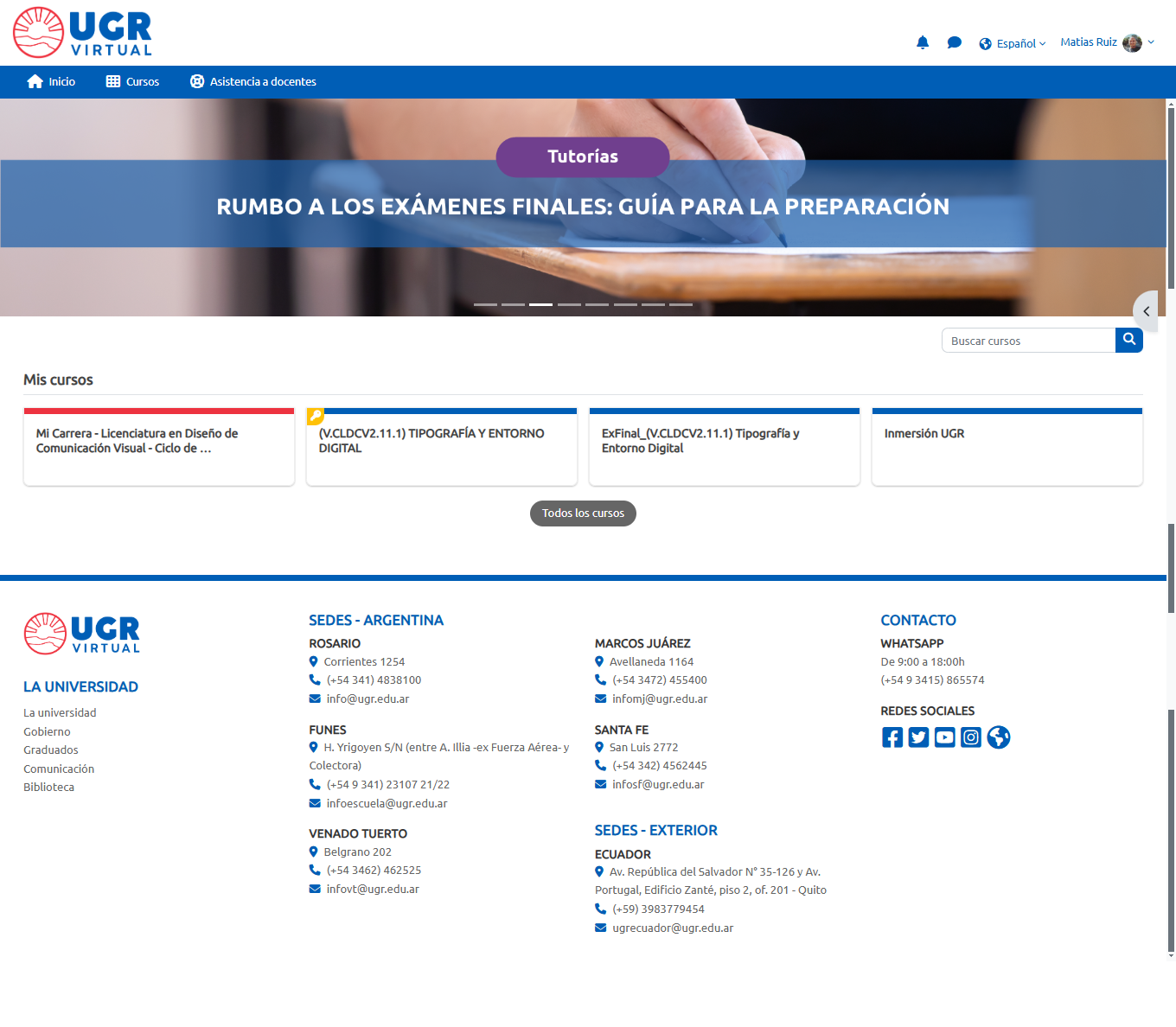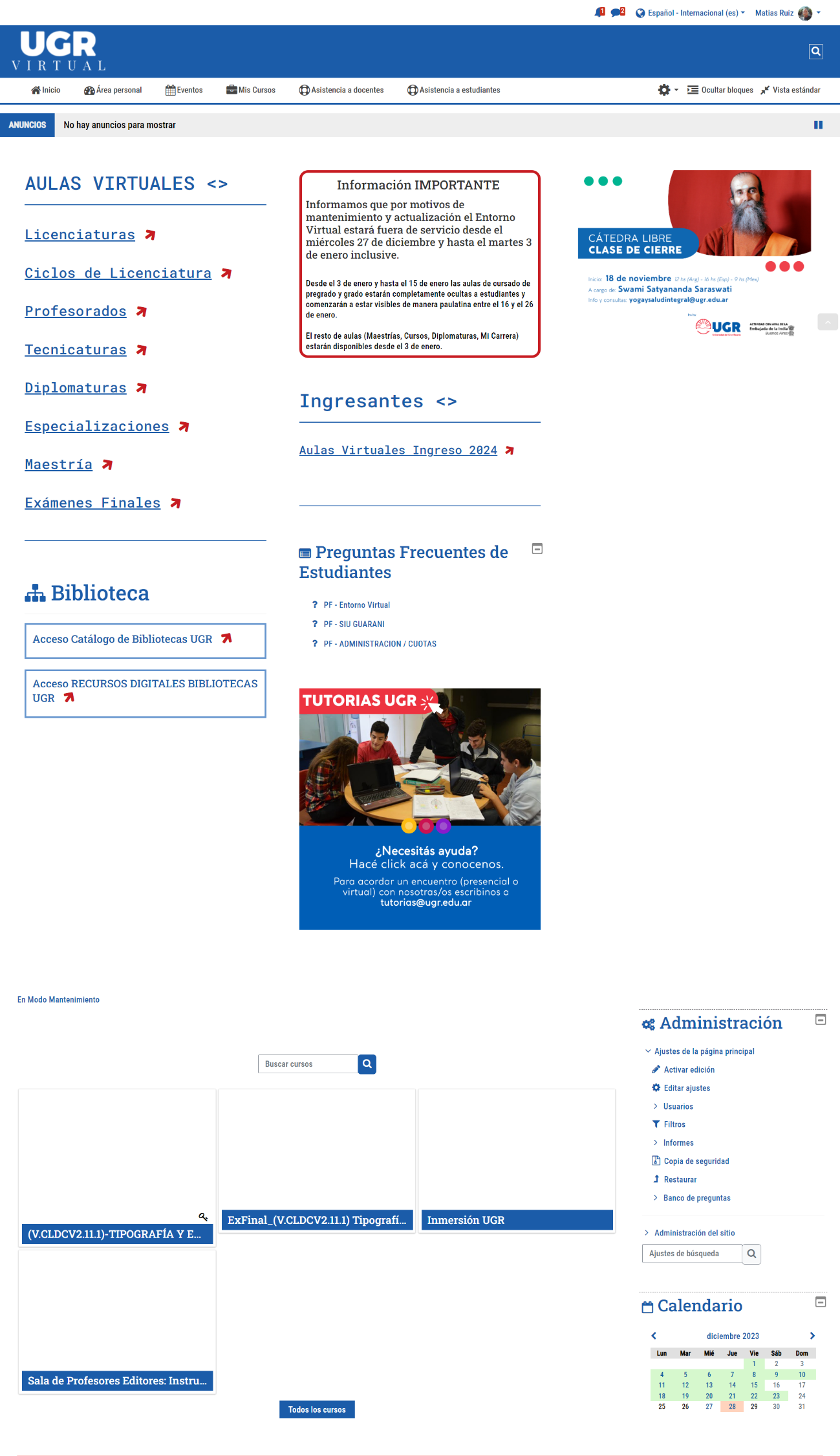 En la página de inicio se eliminaron accesos que solo eran relevantes para administradores y moderadores. Los accesos generales se organizaron en un menú desplegable, y las imágenes publicitarias —que anteriormente replicaban contenido de Instagram— fueron reemplazadas por un carrusel institucional más sobrio. Se priorizó el acceso directo a las aulas en las que el usuario está matriculado, mejorando la eficiencia de la navegación.